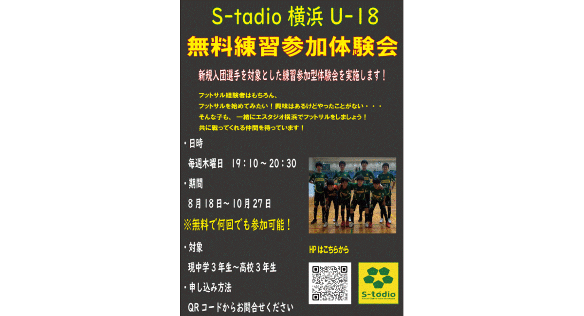 エスタジオ横浜U-18が、無料練習参加体験会を実施しております。