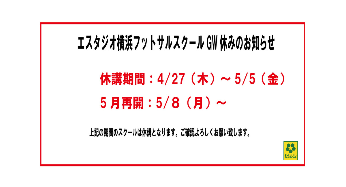 明日4/27~5/5までスクールはGW休みとなりますのでご確認をお願い致します。