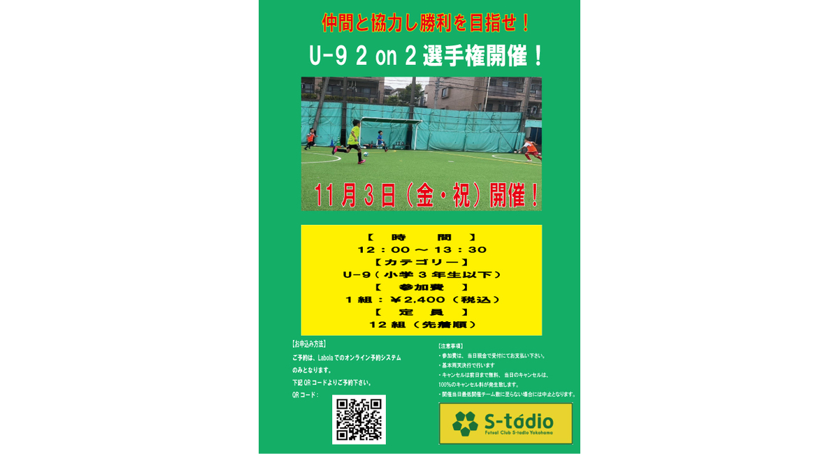 10月に開催しました、2on2選手権を11月も開催することが決定いたしました。まずは、前回と同じU-9カテゴリーとなります。