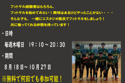 こんばんは!   エスタジオ横浜U-18が、無料練習参加体験会を実施しております。 フットサルをやりたい、やってみたい!そんな想いを持った、中学校3年生~高校3年生は是非この機会にエスタジオ横浜U-18...