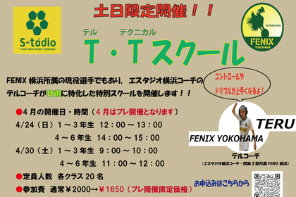 こんばんは! 4月から土日限定で新スクールを開校します! その名も、T・Tスクールです! T・Tとは、テル・テクニカルの略で、エスタジオ横浜コーチでもあり、FENIX横浜の現役フットサル選手による技術...