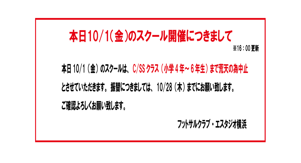 本日10/1(金)のC・SSクラス(小学4~6年生)までのスクールは、荒天の為中止とさせてただきます。