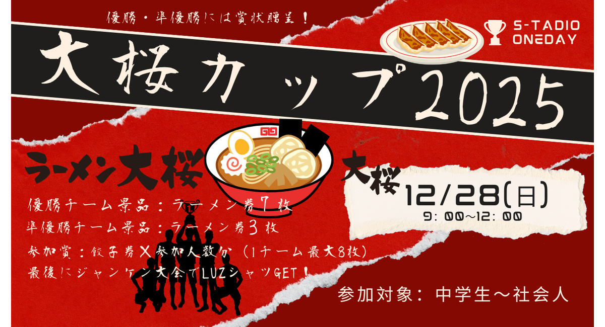 🥇優勝:ラーメン大桜無料券×7 枚& エスタジオ横浜レンタルコート1時間無料