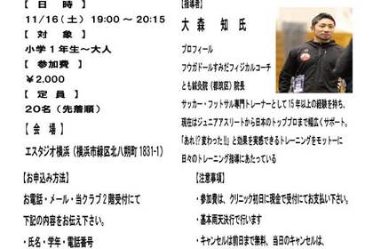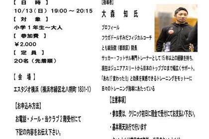 神奈川県フットサルリーグ1部所属フェニックス横浜現役GK鶴岡嗣泰選手によるGKクリニックを開催致します。 少人数制で、より競技志向の方がたくさんトレーニングできるプログラムとなっております。 先着...