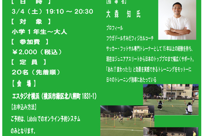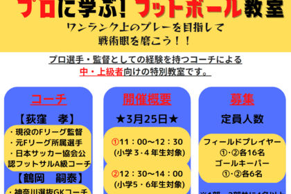 3月25日(土)第二回開催! プロに学ぶ!「フットボール教室」です!! ご予約はこちらから フットサルのプロリーグであるFリーグで、選手・監督として活躍してきた荻窪孝氏を講師として招きました...