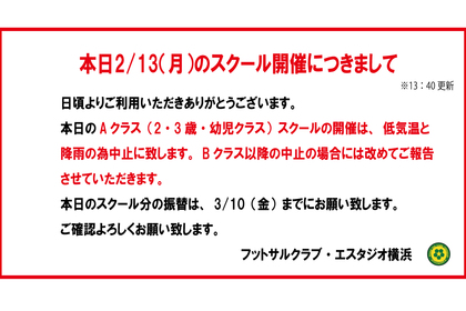 日頃よりご利用いただきありがとうございます。 本日のAクラス(2・3歳・幼児クラス)スクールの開催は、低気温と降雨の為中止に致します。 Bクラス以降の中止の場合には改めてご報告させていただきます...