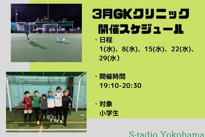 3月ゴールキーパー(GK)クリニックのお知らせです。 ●開催日時 毎週水曜日(1日・8日・15日・22日) 19時10分~20時30分 前半で基礎トレーニング 後半で月のテーマに沿ったトレーニング ...