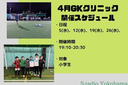 4月ゴールキーパー(GK)クリニックのお知らせです。 ●開催日時 毎週水曜日(5日・12日・19日・26日) 19時10分~20時30分 前半で基礎トレーニング 後半で月のテーマに沿ったトレーニング ...