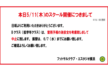 日頃よりご利用いただきありがとうございます。 本日のBクラスのスクールは、荒天のため中止に致します。 振替は、6/7(水)までにお願い致します。 ご確認よろしくお願い致します。 ...