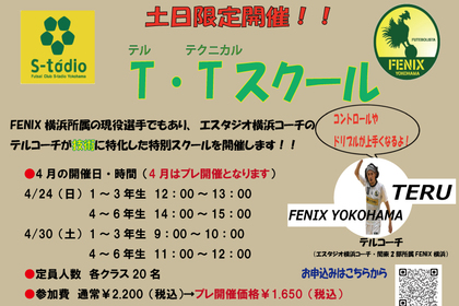 4月から土日限定でT・Tスクールを開校します! T・Tとは、テル・テクニカルの略で、エスタジオ横浜のコーチでもあり、FENIX横浜現役選手のテルコーチによる技術に特化したスクールです! ボールコントロー...