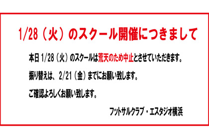 本日1/28(火)のスクールは、雨天と低気温のため中止とさせていただきます。 振り替えは、2/21(金)までにお願い致します。 ご確認宜しくお願い致します。 ...