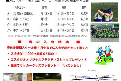 今年も開催致します! 「春休み短期フットサルスクール!」 春休みを利用して、フットサルをやってみたい子ども達大募集です! フットサルは、サッカーの上達にも役立ちます! フットサルは、ボール...